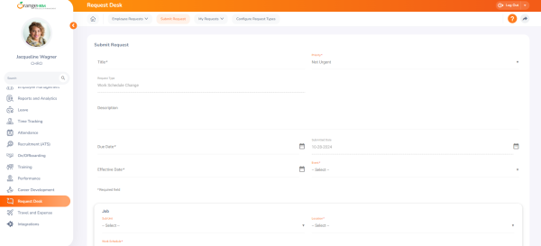 The Request Desk has been upgraded to allow a more comprehensive transfer of job details in employee information requests. In addition to basic job fields, you can now transfer detailed information such as work schedules, EEO job categories, cost center data, FLSA exemption status, and comments. This added functionality allows HR teams to include all relevant details when managing job-related requests.